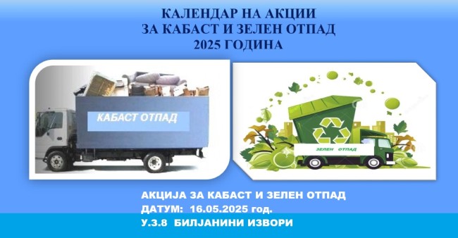 Ј.П.„Охридски Kомуналец” на ден 16.05.2025 год.(петок) ќе организира акција за подигнување кабаст отпад (стар мебел, душеци, телевизори, шпорети, теписони и др.) и зелен отпад (зелен отпад од уредување на дворни површини и градини) од У.З.8 „Билјанини Извори”