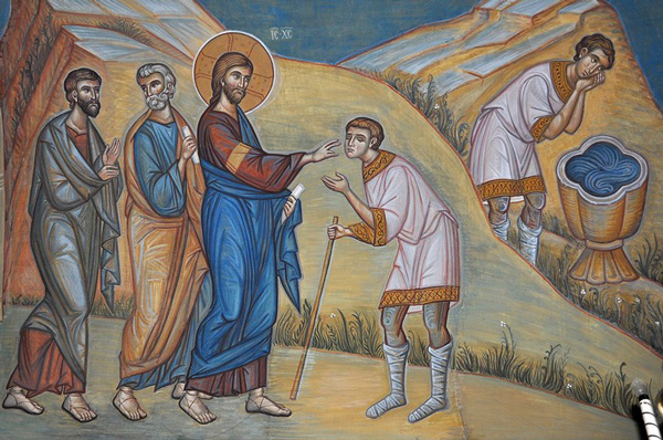 Во овој ден го празнуваме чудото на Господ Бог и Спасителот наш Исус Христос, што го направи над слепородениот. И ова чудо го направи со помош на вода, како и она со Самарјанката и со раслабениот. А се случи вака: Додека Господ разговараше со Јудеите и Себе се правеше рамен на Отецот, велејќи: Јас постојам уште пред да се роди Авраам, тие зедоа камења за да ги фрлат по Него. Но Он, заминувајќи оттаму, најде еден слеп човек кој одеше со пипање. Така било од неговото раѓање, имајќи ги само празнините во очите. Учениците, пак, Го прашаа Спасителот: Учителу, кој згрешил? – Тој или родителите негови? Ова прашање тие го поставија затоа што Господ порано на раслабениот беше му рекол: Ете, сега си здрав, и повеќе не греши; па мислеа дека причина за неговото слепило се гревовите негови или на неговите родители. Отфрлајќи ги сите овие работи, Христос рече: Ова не е од тие причини, туку за да се јават делата на Бога, односно Моите. Штом го рече тоа, Христос плукна на земјата, направи кал и го намачка местото кај што се наоѓаат очите, и му нареди да отиде во бањата Силоам и да се измие, за да покаже дека Он е тој што во почетокот зеде прав од земјата и го создаде човекот. И бидејќи окото е еден од најважните органи на телото, го создава, иако тоа не постоеше, за да покаже, исто така, дека Он е тој што и дава движење и на душевната сила. Он не се служи со вода, туку со Својата плунка, за да се знае дека секоја благодат доаѓа од Неговата уста. Откако се изми, слепиот прогледа. Неговите соседи и тие што го познаваа, кога видоа дека тој прогледал, се збунија. Самиот, пак, признаваше дека порано бил слеп и, кога го прашаа за причината на неговото прогледување, тој раскажуваше дека Христос е исцелителот на неговата мака. А фарисеите, кога слушнале за ова преславно чудо, повторно го обвинуваа Спасителот дека не ја почитува саботата, бидејќи, како што се чини, и ова чудо, со слепиот, се случило во сабота. И настана расправија меѓу нив: едни велеа дека Исус е од Бога, поради чудата што се случуваа, а други велеа дека не е од Бога, бидејќи не ја почитува саботата. Фарисеите пак му рекоа на слепиот: Прослави Го Бога, бидејќи исцелението е од Него, а не од Христа, оти Тој е грешен, затоа што ја разорува саботата. Слепиот одговори: Ако Он не е испратен од Бога, не би можел да го направи ова чудо. Тогаш тие почнаа да го навредуваат и го избркаа од синагогата. Отпосле го најде Исус и му рече: Веруваш ли ти во Синот Божји? А тој, кога дозна Кој е Оној што му зборува, Му се поклони и стана Негов ученик, проповедајќи го Неговото добро дело.