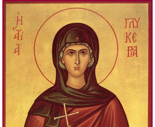 Ќерка на еден гувернер на Рим. По смртта на татко ѝ, осиромаши и се насели во Трајанопол во Тракија. Во времето на нечестивиот цар Антонин Гликерија беше изведена да му принесе жртва на идолот на Диј. Таа си нацрта крст на челото, па кога царскиот намесник ја запраша каде е нејзината лампада (зашто сите носеа лампади во рацете), Гликерија го покажа крстот на челото и рече: „Ова е мојата лампада“. На нејзината молитва гром удри во идолот и го искрши на парчиња. Намесникот се разгневи и нареди да ја бијат и да ја затворат. Ги запечати затворските врати, решен да ја убие со глад. Меѓутоа, на Гликерија ѝ се јавуваше Ангел Божји и ѝ даваше небесна храна. По извесно време, кога намесникот мислеше дека маченичката мора да умрела од глад, го отвори затворот и се зачуди кога ја виде здрава, светла и весела. Кога го виде ова чудо, стражарот Лаодикиј и самиот Го исповеда Господ Христос и веднаш беше заклан. По ова, Гликерија беше фрлена во огнена печка, но остана неповредена од огнот. Стоејќи насред огнот Го фалеше Бога, споменувајќи го чудото со Тројцата Младенци во Вавилонската печка. Најпосле беше фрлена пред лавови и откако Му се помоли, оваа света девица Му ја предаде својата душа на Господа, за Кого јуначки претрпе многубројни маки. Чесно пострада во 177 година. Од нејзините мошти потече целебно миро, кое исцелуваше болни од најтешки болести.