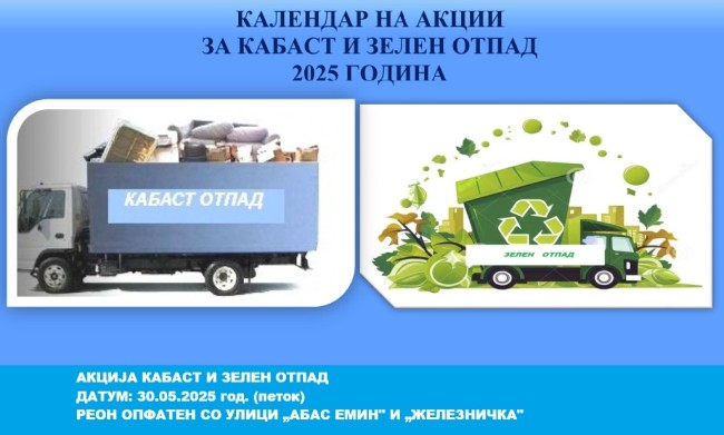 Ј.П.„Охридски Kомуналец” на ден 30.05.2025 год.(петок) ќе организира акција за подигнување кабаст отпад (стар мебел, душеци, телевизори, шпорети, теписони и др.) и зелен отпад (зелен отпад од уредување на дворни површини и градини) од реон опфатен со улиците „Абас Емин” и „Железничка”