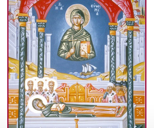 Оваа светителка се празнува на 11 септември, на денот кога пострада. На ова место пак се спомнува чудотворноста на нејзините чесни мошти, пројавена на IV Вселенски Собор во Халкидон. Овој Собор беше свикан во времето на царот Маркијан и царицата Пулхерија во 451 година, по смртта на царот Теодосиј Помладиот. Повод за свикување на Четвртиот Собор беше ереста на Диоскор, патријарх Александриски, и на Евтихиј, архимандрит Цариградски. Тие го распростираа лажното учење дека во Христа да немало две природи, човечката и Божествената, туку само една, Божествената. На овој Собор највидна улога играа цариградскиот патријарх Анатолиј и јерусалимскиот патријарх Јувеналиј. Бидејќи со препирања и докажувања од две спротивни страни не може да се дојде до никакво одредено решение, патријархот Анатолиј предложи и православните и еретиците да го напишат своето исповедање, па да ги положат во ковчегот со моштите на Света Ефимија. Со ова се согласија сите. Двете вероисповедања, значи, беа напишани и ставени на градите на великомаченичката, ковчегот беше затворен и запечатен со царски печат и уште беше поставена војничка стража. Тогаш сите поминаа три дена во пост и во молитва. Четвртиот ден, кога го отворија гробот, го видоа православното исповедање во десната рака на светителката, а еретичкото под нејзините нозе. Така спорот се реши со Божја сила во корист на Православието. Во времето на царот Ираклиј моштите на света Ефимија беа пренесени од Халкидон во Цариград, во црквата што ѝ е посветена, близу хиподромот. Иконоборниот цар Лав Исавријанин нареди и ги фрлија моштите во морето; но на чудесен начин ковчегот беше пренесен на островот Лимнос и положен во црквата на Светата маченичка Гликерија. Дури во времето на царицата Ирина ковчегот со моштите беше повторно вратен во Цариград на своето старо место. Од овие мошти одвреме-навреме течеше крв, којашто им помагаше на болните и на неволните.