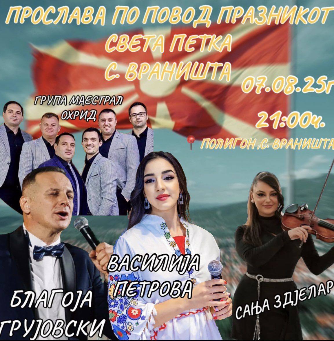 Имено на 7 август (четврток), во навечерието на празникот преподобна маченичка Параскева, ќе се отслужи Вечерна богослужба во храмот „Св. Петка“ – село Враништа, со почеток во 19:30 часот.