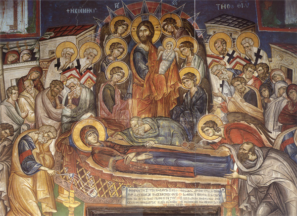Господ, Кој на Синај заповеда со петтата заповед: „Почитувај ги таткото свој и мајката своја“, со Својот пример покажа како треба да се почитува својата родителка. Кога висеше на крстот во маки, се сети на Неговата мајка и покажувајќи на апостолот Јован, рече: „Жено, ете ти син!“ Потоа му рече на Јован: „Ете ти мајка!“ И така ја згрижи Својата Мајка и издивна. Јован имаше дом на Сион во Јерусалим, во којшто се насели и Богородица и остана да живее во него до крајот на Нејзините денови на земјата. Со своите молитви, со благите совети, кротоста и трпеливоста, таа многу им помагаше на апостолите на Нејзиниот Син. Целото време до смртта главно го помина во Јерусалим, обиколувајќи ги често оние места што ја потсетуваа на големите настани и големите дела на Нејзиниот Син. Особено често одеше на Голгота, во Витлеем и на Елеонската Гора. Од нејзините подолги патувања се спомнува нејзината посета на свети Игнатиј Богоносец во Антиохија, посетата на светиот четиридневен Лазар, епископ Кипарски, посетата на Света Гора, којашто самата ја благослови, и пребивањето во Ефес, заедно со свети Јован, за време на големото гонење на христијаните во Јерусалим. На старост таа често Му се молеше на Бога на Елеонската Гора, на местото на Неговото Вознесение, што порано да ја земе од овој свет. Еднаш ѝ се јави Архангелот Гавриил и ѝ објави дека по три дена ќе биде упокоена. Тогаш ѝ даде и една палмова гранка за да ја носат на нејзиниот погреб. Таа се врати дома со голема радост и посака во срцето уште еднаш да ги види сите Христови апостоли. Господ ѝ ја исполни оваа желба и сите апостоли, носени на облаци од Ангелите, одеднаш се собраа во домот на Јован на Сион. Со голема радост таа ги виде Светите апостоли, ги охрабри, ги посоветува и ги утеши, и по ова мирно го предаде својот дух на Бога, без никаква мака и телесна болест. Апостолите го зедоа одарот со нејзиното тело, од коешто излегуваше благоухание и во придружба на мноштво христијани го пренесоа во Гетсиманската градина, во гробницата на светите Јоаким и Ана. По Божја Промисла поворката од злобните Евреи ја засолнуваше облак. Некој еврејски свештеник Атониј, го дофати со рацете одарот со намера да го преврти, но во тој миг ангел Божји му ги отсече обете раце. Тогаш тој повика кон апостолите за помош, а откако објави дека поверувал во Господа Исуса Христа, беше исцелен. Апостолот Тома повторно – по Божја Промисла – изостана, та на тој начин да се открие една нова и преславна тајна за Пресвета Богородица. Третиот ден пристигна и тој, и посака да го целива телото на Пречистата Владичица. Но, кога апостолите го отворија гробот, ја најдоа само плаштаницата, а телото не беше внатре. Таа вечер им се јави на апостолите самата Пресвета Богородица опкружена со мноштво ангели и им рече: „Радувајте се, ќе бидам со вас вовек“. На која возраст се упокои Богородица не се знае точно, но преовладува мислењето дека на крајот од овоземниот живот имала повеќе од шеесет години.
