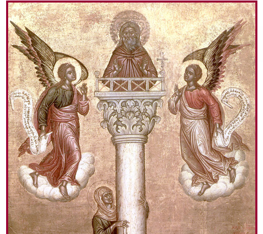 Родум Сириец, од родители селани. Во својата осумнаесетта година побегна од родителите и се замонаши. Се предаваше себеси на најтешки подвизи, понекогаш постејќи по четириесет дена. Потоа се предаде на особен подвиг: имено, деноноќно стоеше на столб, во непрестајна молитва. Неговиот столб најпрво беше висок шест лакти, потоа му подигнаа еден од дванаесет, па од дваесет и два, па од триесет и шест, и најпосле столб висок четириесет лакти. Мајка му Марта двапати доаѓаше да го види, но тој не ја примаше, туку од столбот ѝ рече: „Не ме вознемирувај сега, мајко, ако се удостојам ќе се видиме во оној свет.“ Свети Симеон претрпе безбројни напади од демоните, но сите ги победи со молитва кон Бога. Овој светител изврши големи чуда и мнозина болни ги исцели со збор и со молитва. Околу неговиот столб притекнуваше народ од сите страни, богати и сиромашни, цареви и робови. И тој им помагаше на сите: на некои враќајќи им го телесното здравје, на некои давајќи им утеха и поука, а некои разобличувајќи ги заради нивната еретичка вера. Така ја одврати царицата Евдокија од Евтихиевата ерес и ја приведе кон Православието. Свети Симеон се подвизуваше за време на царевите Теодосиј Помладиот, Маркијан и Лав Велики. Овој прв столпник во христијанството и голем чудотворец поживеа сто и три години и се упокои во Господ на 14 септември, 459 година. Неговите мошти се пренесени во Антиохија, во црквата посветена на неговото име.