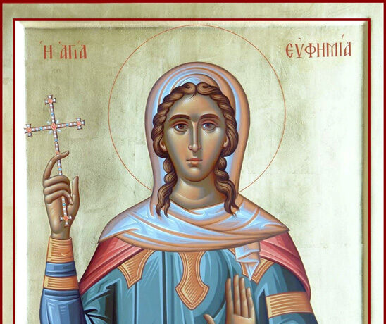 Родум од Халкидон. Татко ѝ беше сенаторот Филофрон, а мајка – Теодорисија, обајцата благочестиви христијани. Ефимија беше прекрасна девица и по тело и по душа. Кога антипатот Приск устрои празник за жртвопринесување на Ареј во Халкидон, тогаш четириесет и деветмина христијани за да го одбегнат тоа скверно жртвопринесување се сокрија. Меѓутоа, ги пронајдоа и ги изведоа пред Приск. Меѓу нив беше и Ефимија. Кога надмениот Приск ги запраша зошто не ѝ се покоруваат на царската заповед, тие одговорија: „И на царската и на твојата заповед треба да ѝ се покориме, ако не Му се противи на небесниот Бог; ако пак се противи на небесниот Бог, не само што не треба да ѝ се покоруваме туку треба и да ѝ се противиме.“ Тогаш Приск ги стави на разни маки, и тоа деветнаесет дена по ред, секојдневно. Дваесеттиот ден ја одвои од останатите Ефимија и почна да ѝ ласка за нејзината убавина за да ја придобие за идолопоклонството. А, бидејќи сите ласкања пропаднаа залудно, заповеда да ја мачат девицата. Ја мачеа прво на тркало, но ангел Божји ѝ се јави и го искрши тркалото. Потоа, ја фрлија во огнена печка, но со Божја сила беше сочувана. Кога го видоа тоа, двајцата војници Виктор и Состен поверуваа во Христа, заради што беа фрлени пред ѕверовите и така славно го завршија својот живот. Потоа, Ефимија беше фрлена во ров исполнет со вода и со секаква отровна нечистотија, но таа ја прекрсти водата кога влезе во ровот и остана неповредена. Најпосле, ја изведоа пред дивите ѕверови, таа со благодарност Му се помоли на Бога и го предаде својот дух. Нејзините родители чесно го погребаа телото. Пострада во 304 година и се пресели во вечната радост. Се споменува и на 24 јули.