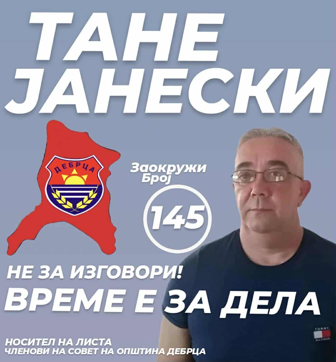 Тане Јанески е независен кандидат на претстојните локални избори за член на Советот на Општина Дебрца. Тој ја истакнува својата посветеност кон транспарентност, отчетност и практични решенија за секојдневните потреби на граѓаните.