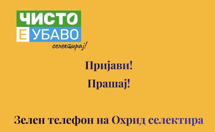 Отвараме зелен телефон на којшто ве повикуваме да ги пријавувате сите проблеми и недоследности во собирањето на селектираниот отпад. Воедно на истиот телефон можете да ги насочите сите прашања поврзани со воспоставувањето на системот за примарна селекција на отпад во Охрид.