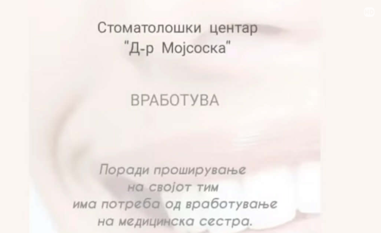 Поради проширување на својот тим Стоматолошкиот центар „Д-р Мојсоска“ има потреба од вработување на медицинска сестра.