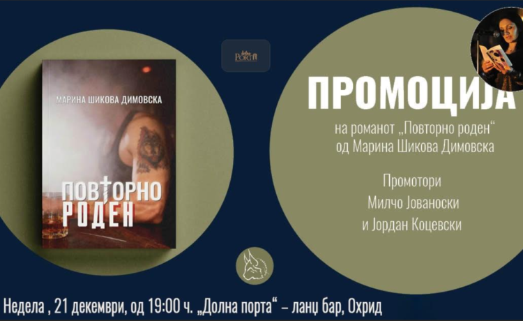 В недела, 21 декември од 19 часот во ланџ бар „Долна порта“ ќе биде промовирано новото книжевно остварување на Марина Шикова Димовска, романот „Повторно роден“ – издание на ПНВ Публикации – Скопје.
