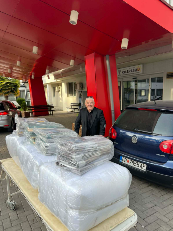 Страшо Трајковски од Прилеп, задоволен пациент кој неодамна се лекувал во Специјалната болница за ортопедија и трауматологија Св. Еразмо, покажа хуманост и благодарност со донација на 20 комплети перници со постелнина.
