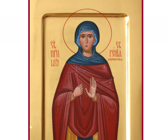 Ќерка на Филип, којшто беше епарх на целиот Египет. Родена е во Рим. Во тоа време христијаните беа прогонувани од Александрија и живееја надвор од градот. Девицата Евгенија ги посетуваше христијаните и со сето срце ја прими нивната вера. Побегна од родителите и со двајца свои верни евнуси се крсти од епископот Елиј, па преоблечена во машка облека стапи во еден машки манастир и таму прими монашки чин. Толку го очисти своето срце со доброволен подвиг, што од Бога прими благодат на исцелување на болните. Така исцели една богата жена, Меланија. Но, потоа, истата жена, мислејќи дека Евгенија е машко, сакаше да ја навлече на телесен грев. Па, бидејќи Евгенија одлучно ја одби, оваа зла жена за одмазда отиде кај епархот и ја наклевети Евгенија исто онака како што некогаш Петефриевата жена го обвини целомудрениот Јосиф. Епархот нареди и сите монаси ги оковаа и ги фрлија во затвор заедно со Евгенија. Но, кога ја изведоа на суд, светата Евгенија му се покажа на татко ѝ како негова ќерка. Израдуван, Филип се крсти заедно со сиот негов дом. По ова беше избран за епископ на Александрија. Кога слушна за ова римскиот цар, испрати еден свиреп војвода Теренциј, којшто дојде во Александрија и тајно го уби Филип. Тогаш светата Евгенија заедно со мајка ѝ и со браќата се пресели во Рим. Таму храбро и ревносно ги обраќаше незнабошците во вистинската вера, особено девојките. Така, обрати и некоја прекрасна девојка Василија. Наскоро таа беше убиена за Христа, како што ѝ прорече света Евгенија. Тогаш ги убија и оние двајца евнуси, Прот и Јакинт. Најпосле дојде и маченичкиот крај на Света Евгенија. Од нејзиното присуство падна идолскиот храм на Дијана и се разурна. Мачителите најпрво ја фрлија во вода, а потоа во оган, но Бог ја спаси. Во затворот ѝ се јави Самиот Господ Исус и ѝ рече дека ќе пострада на самиот ден на Неговото Рождество. Така и стана. Ја убија со меч на 25 декември 262 година во Рим. После својата смрт, Света Евгенија ѝ се јави на својата мајка во голема слава и ја утеши.