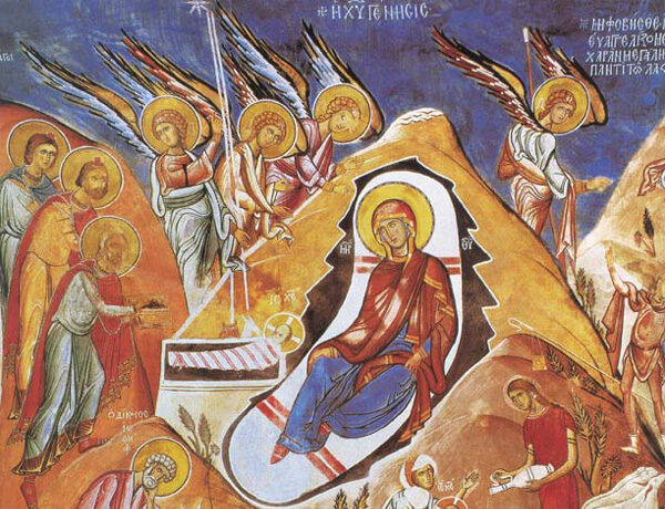 Акога се наврши времето, Бог Го испрати Синот Свој Единороден (Гал. 4, 4) за да се спаси човечкиот род. И кога се исполнија девет месеци од благовеста којашто архангелот Гавриил ѝ ја јави на Пресветата Дева во Назарет велејќи: „Радувај се, благодатна…, еве ќе родиш и ќе зачнеш син“ – во тоа време излезе заповед од кесарот Август да се попише сиот народ во римското царство. Според на таа заповед, секој требаше да отиде во својот град и таму да се попише. Праведниот Јосиф со Пресветата Дева појде во Витлеем, градот Давидов, зашто обајцата беа од царското колено Давидово. А бидејќи во тој малечок град, заради пописот, се најде многу народ, Јосиф и Марија не можеа да најдат ноќевалиште во ниедна куќа, па се засолнија во една овчарска пештера, каде што пастирите ги чуваа своите овци. Во таа пештера, ноќта меѓу саботата и неделата на 25 декември, Пресветата Дева Го роди Спасителот на светот, Господ Исус Христос. Откако Го роди без болка, како што и Го зачна без грев, од Светиот Дух, а не од човек, таа самата Го пови во ленени пелени, Му се поклони како на Бог и Го положи во јасли. Потоа пријде и праведниот Јосиф, и тој Му се поклони како на Божествен плод на девствена утроба. Тогаш дојдоа и пастирите од полето, упатени од Божјиот ангел и Му се поклонија како на Месија и Спасител, воскликнувајќи: „Слава на Бога во висините и на земјата мир, меѓу луѓето добра волја“ (Лука 2). Потоа пристигнаа тројцата Мудреци од исток, водени со чудесна ѕвезда, со своите дарови: злато, ливан и смирна. Тие на Младенецот Му се поклонија како на Цар над царевите и Го даруваа со своите дарови (Матеј 2). Така дојде во светот Оној Чиешто доаѓање беше пророкувано од пророците, Којшто се роди онака како што беше пророкувано: од Пречиста Дева, во градот Витлеем, од коленото Давидово по тело, во време кога немаше веќе во Јерусалим цар од родот Јудин, туку царуваше Ирод туѓинецот. После сето мноштво на Неговите предобрази и наговестувања, на пратениците и благовесниците, Пророците и праведниците, мудреците и царевите, најпосле се јави Он, Господарот на светот и Царот над царевите, за да го изврши делото на човечкото спасение, коешто не можеа да го извршат Неговите слуги. Нему Му припаѓа вечната слава. Амин.