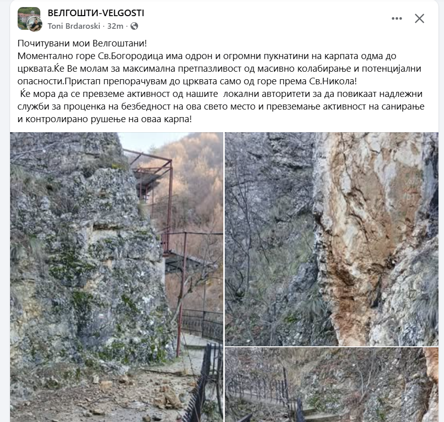 Ќе мора да се превземе активност од нашите локални авторитети за да повикаат надлежни служби за проценка на безбедност на ова свето место и превземање активност на санирање и контролирано рушење на оваа карпа! – информираат од ФБ објавата Велгошти.