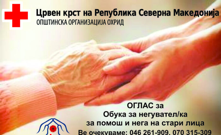 Со цел унапредување и развивање на услугите за долготрајна нега на стари лица преку ангажирање на стручен и професионален кадар, Црвен крст Охрид организира обука за негувател/ка за помош и нега на стари лица. Обуката, која содржи теоретски и практичен дел, ќе се реализира во простории на Црвен крст Охрид и во соодветни установи прилагодени и опремени со потребната опрема и помагала. Обуката ќе ја изведува стручен наставен кадар-едукатори (доктор по медицина, медицинска сестра и социјален работник), пет дена во неделата, во термин кој ќе биде дополнително договорен со учесниците.