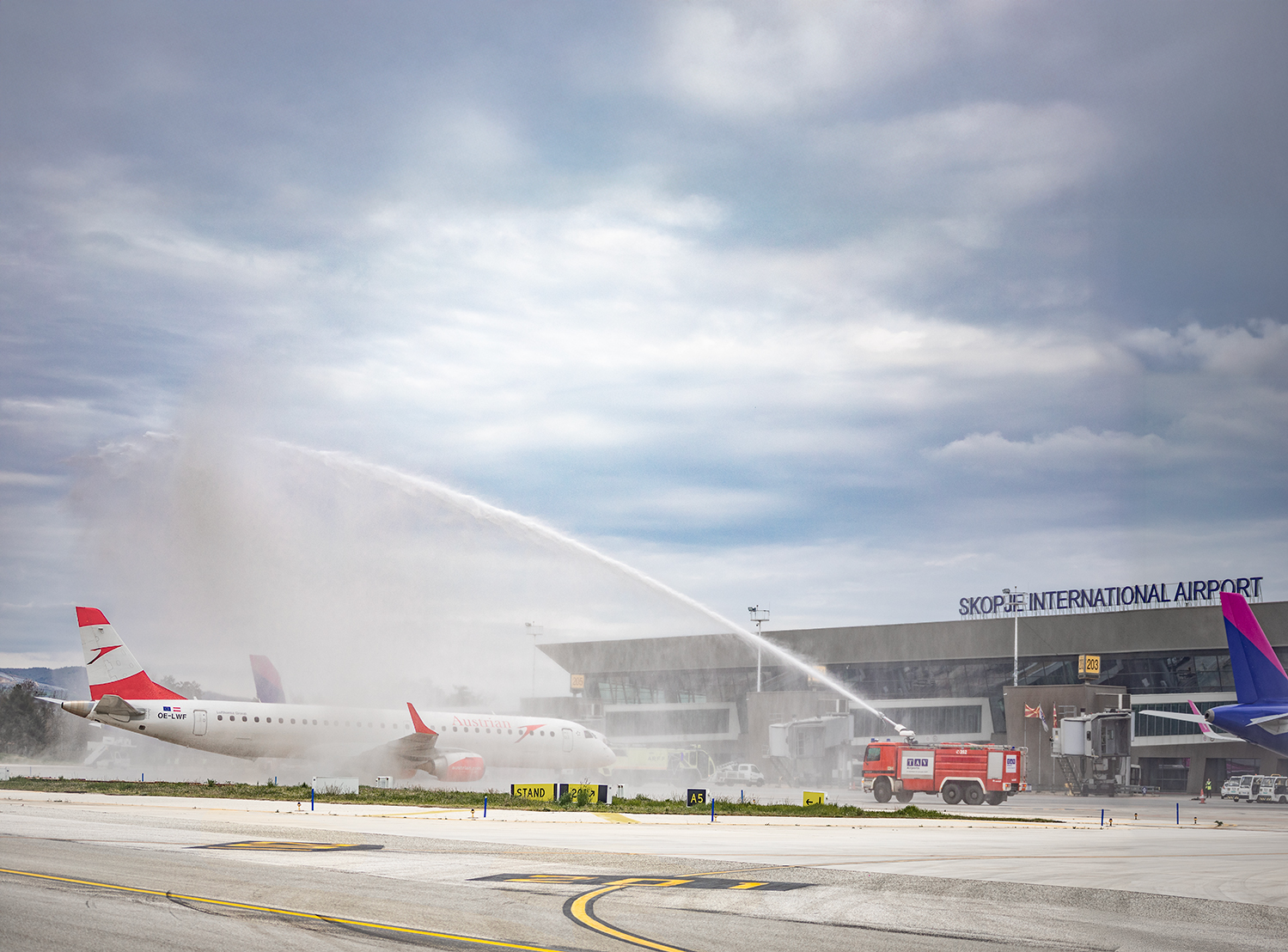 На Меѓународниот Аеродром Скопје со церемонијален воден мост по слетувањето на авионот, беа пречекани патниците, кабинскиот персонал и менаџментот на авиокомпанијата, со што беше одбележан овој значаен јубилеј.