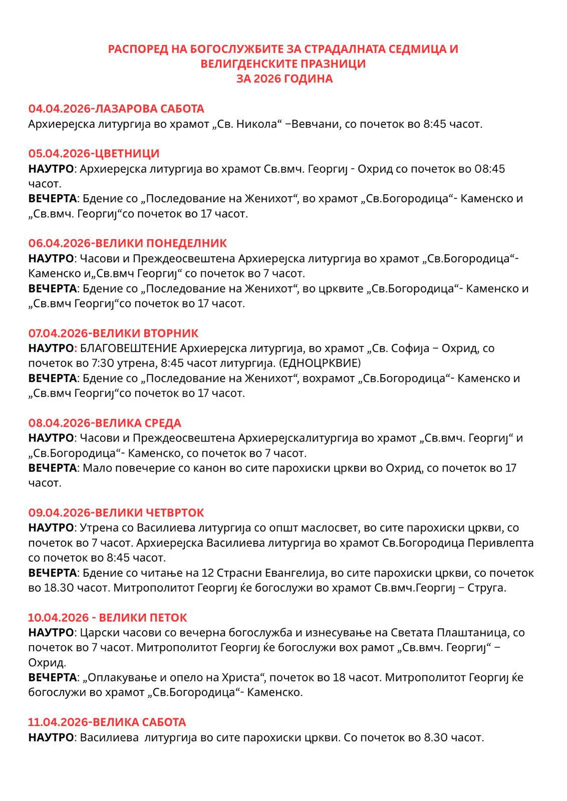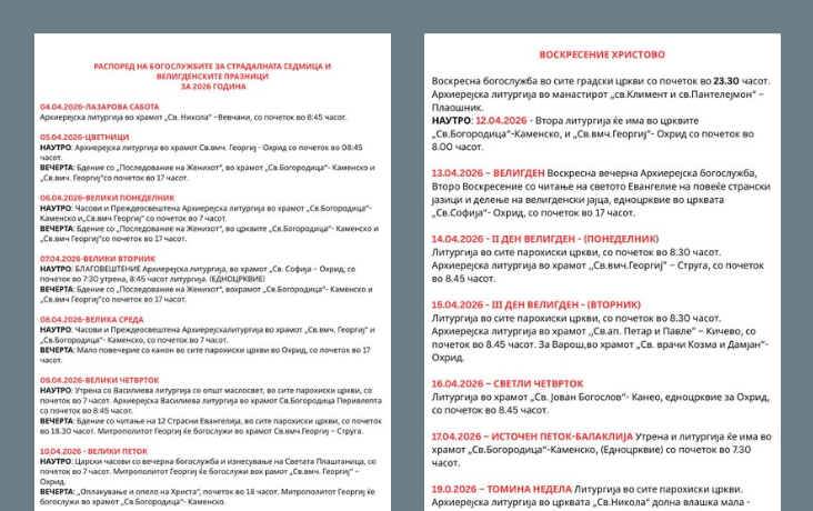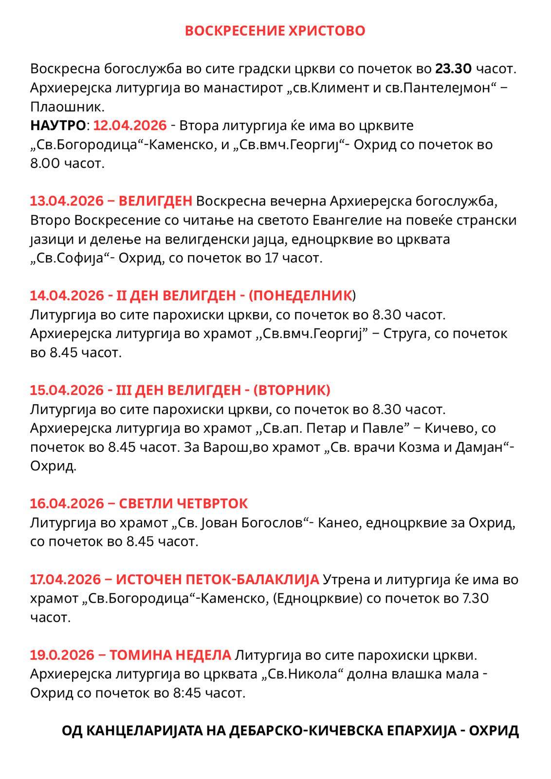 Дебарско-кичевска епархија: Распоред на Богослужбите за Страдалната седмица и Велигденските празници