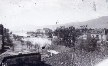 Панорама на дел од Струга во 1935 година со Дримот и Железничкиот мост и новото основно училиште, напред. ...